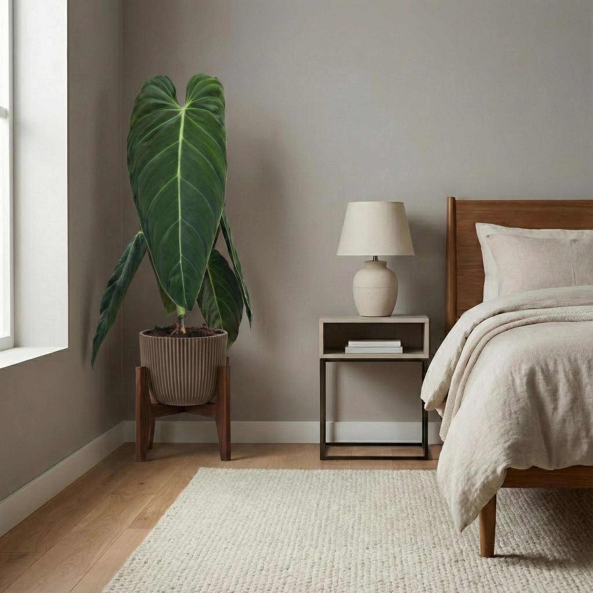 This plant is perfect for the bedroom because it brings instant serenity and tropical charm with minimal effort. Her bold, velvet leaves make a striking statement, while subtly improving the air you breathe. Though she’s not safe for curious pets or children, she’s ideal for stylish, adult-friendly spaces. Low-maintenance, air-cleansing, and full of presence—Mela was made for this room.